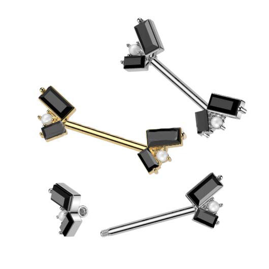 KSQ073 316L Surgical Steel Nipple Barbell With 2 Black Baguette CZ and Pearl Center