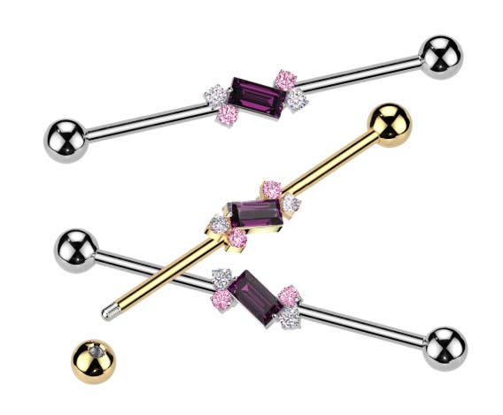 BIQ068 316L Surgical Steel Double Round CZ With Baguette CZ Center Industrial Barbell