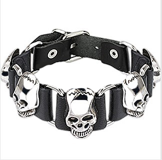 Black Leather Bracelet with Steel Frankenstein Skull with Adjustable Buckle End Closure