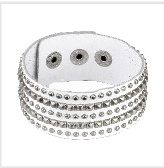 White Leather Multi Micro Pyramid & Round Studs Bracelet with Adjustable Snap Closure