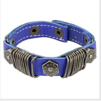 Blue Leather Bracelet with Multi Stapler Rings with Hexa Bolts