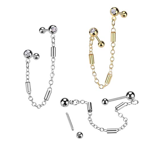 JC034 316L Surgical Steel Pressed Fit CZ Tragus, Cartilage Barbell Studs With Barbell Link Chain