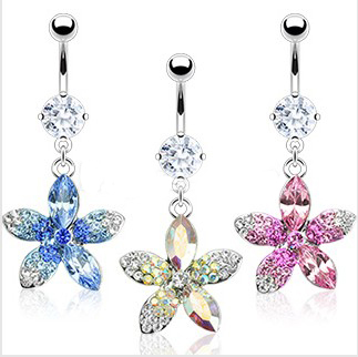 316L Surgical Steel Navel Ring with Multiple Tone CZs Flower Dangle