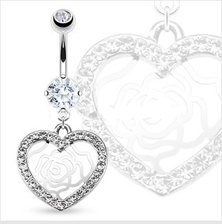 316L Surgical Steel Multi Paved Gem Clear CZ Surrounding Heart Frame with Floral Cut Out Navel Ring