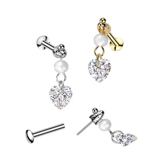 IL23 316L Surgical Steel Threadless Push In Convex Back Stud With CZ Heart And Glass Bead Dangle