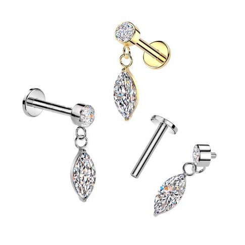 LSI058 All 316L Internally Threaded Flat Back Labret With Bezel Set CZ & Marquise CZ Dangle