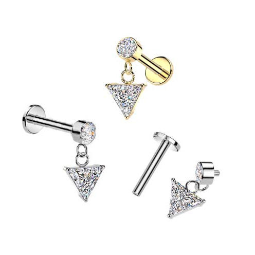 LSI064 All 316L Internally Threaded Flat Back Labret With Bezel Set CZ & Triangle CZ Dangle