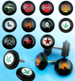 Description : 14ga Faux UV Plugs with Trendy Logos on both sides.