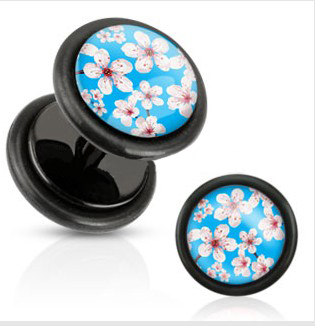 Black Acrylic Fake Plug with Pink Cherry Blossoms Over Blue Print Inlay with O-Rings