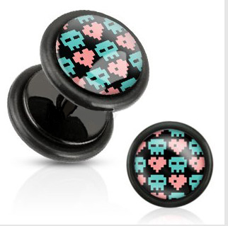 Black Acrylic Fake Plug with Pixel Skull and Hearts Print Inlay with O-Rings