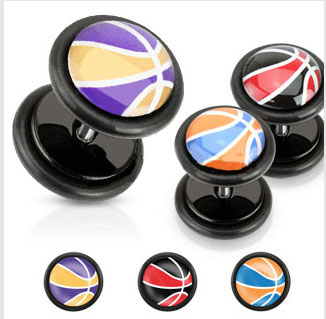 Black Acrylic Fake Plug with Multi Colored Basketball Inlay and O-Rings