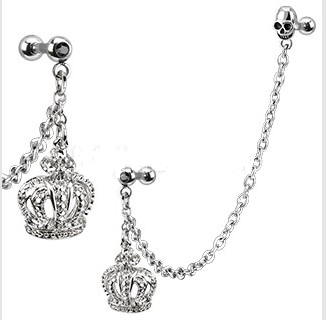 316L Surgical Steel Chain Linked Dangle Royal Crown and Skull with Gemmed Double Cartilage/Tragus Barbell