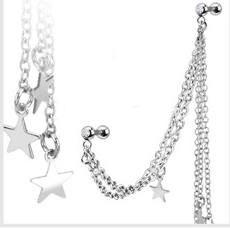 316L Surgical Steel Multi Chain Linked Dangle Stars with Gemmed Double Cartilage/Tragus Barbell