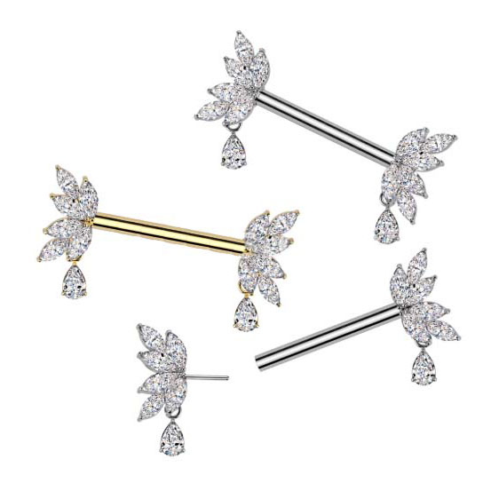 IK24 316L Surgical Steel Threadless Push In Marquise CZ Fan Nipple Barbell With Teardrop CZ Dangle